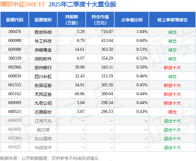 从基金规模来看,博时中证500ETF基金2025年二季度公布的基金规模为6.84亿元,较上一期规模6.77亿元变化了631.67万元,环比变化了0.93%。该基金最新一期资产配置为:股票占净值比94.34%,无债券类资产,现金占净值比5.13%。从基金持仓来看,该基金当季前十大股票仓位达5.41%,第一大重仓股为胜宏科技(300476),持仓占比为1.04%。